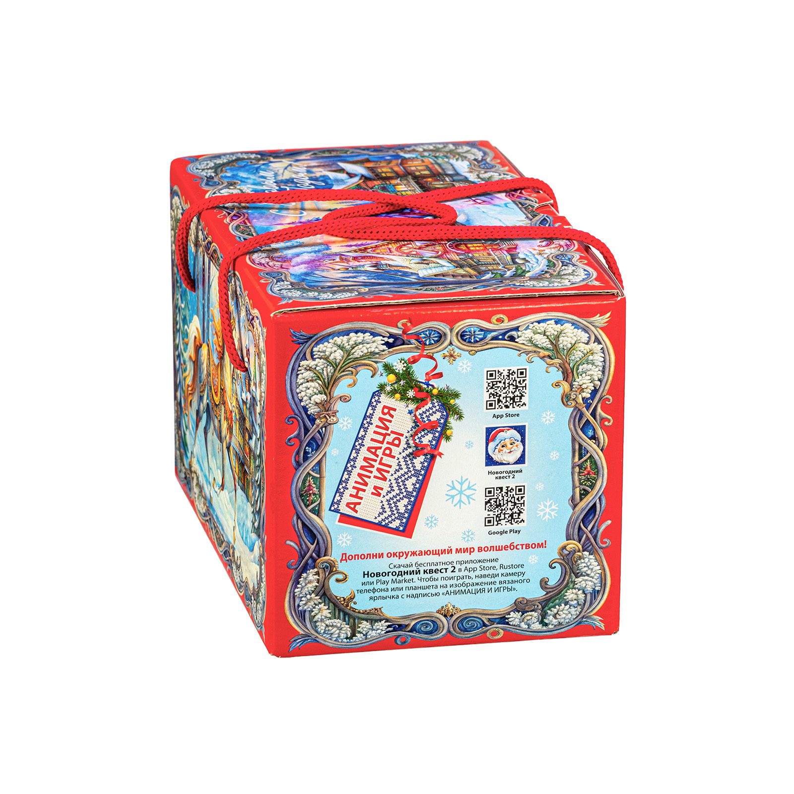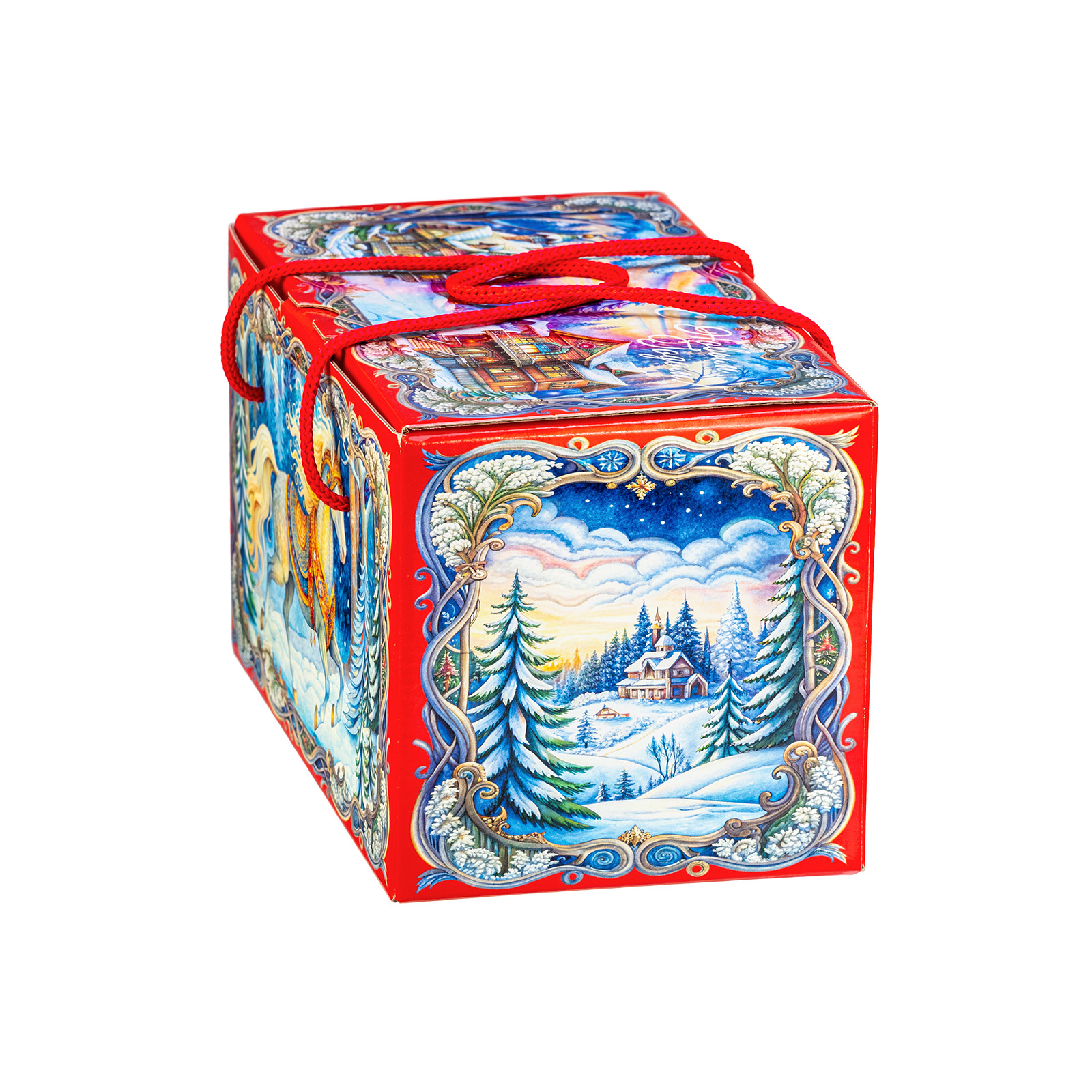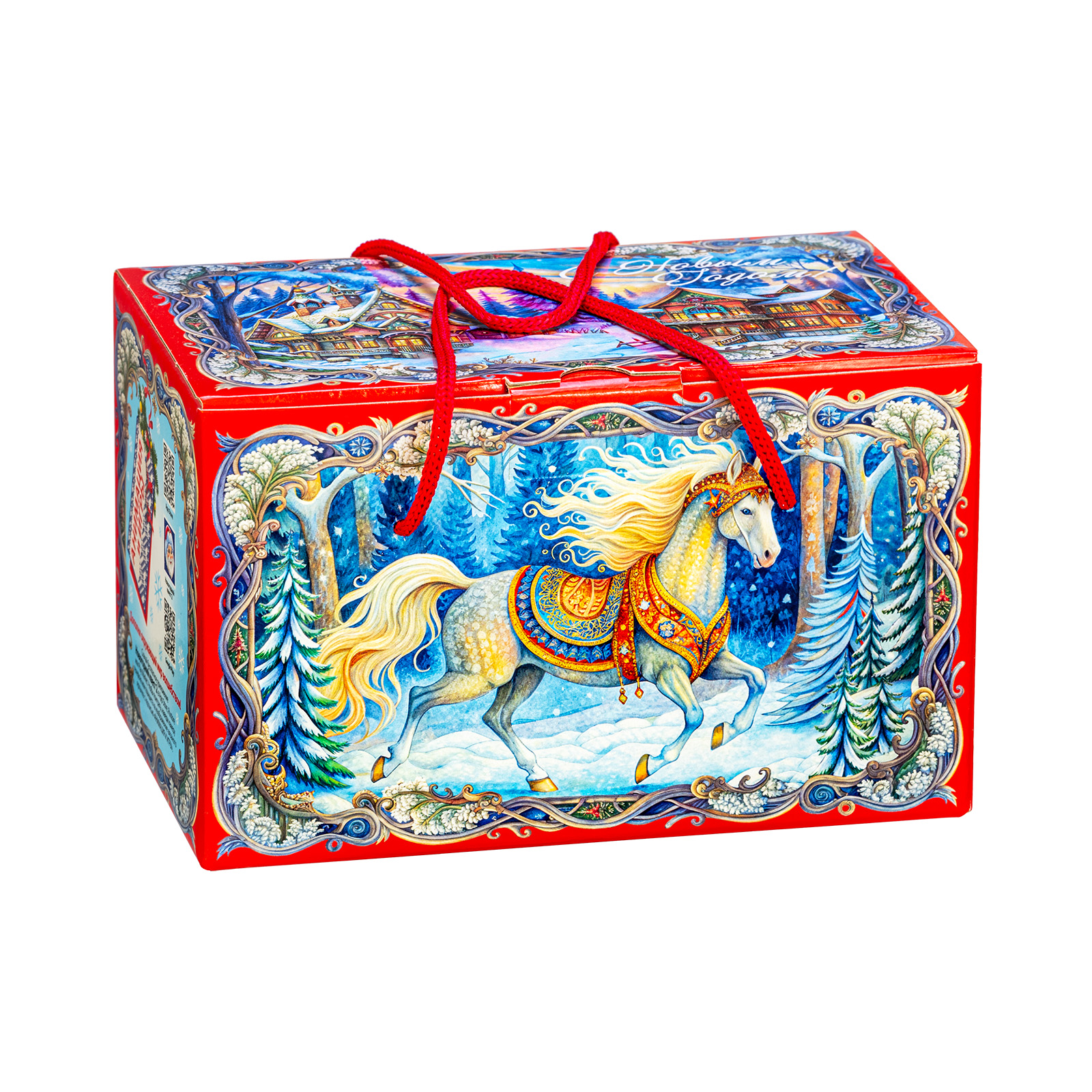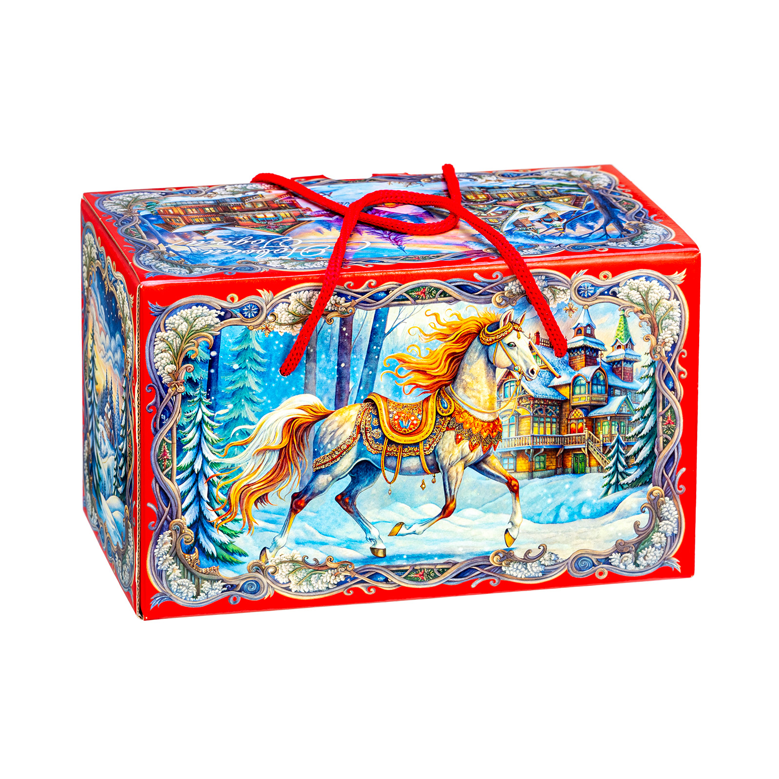 Интересный вариант новогоднего подарка – «На лесной опушке». Он представлен в разделе Картон. Отлично подойдет на подарок в 2026 году с символом Лошадь. Внутри такого презента находится кондитерский набор весом 1000 граммов.